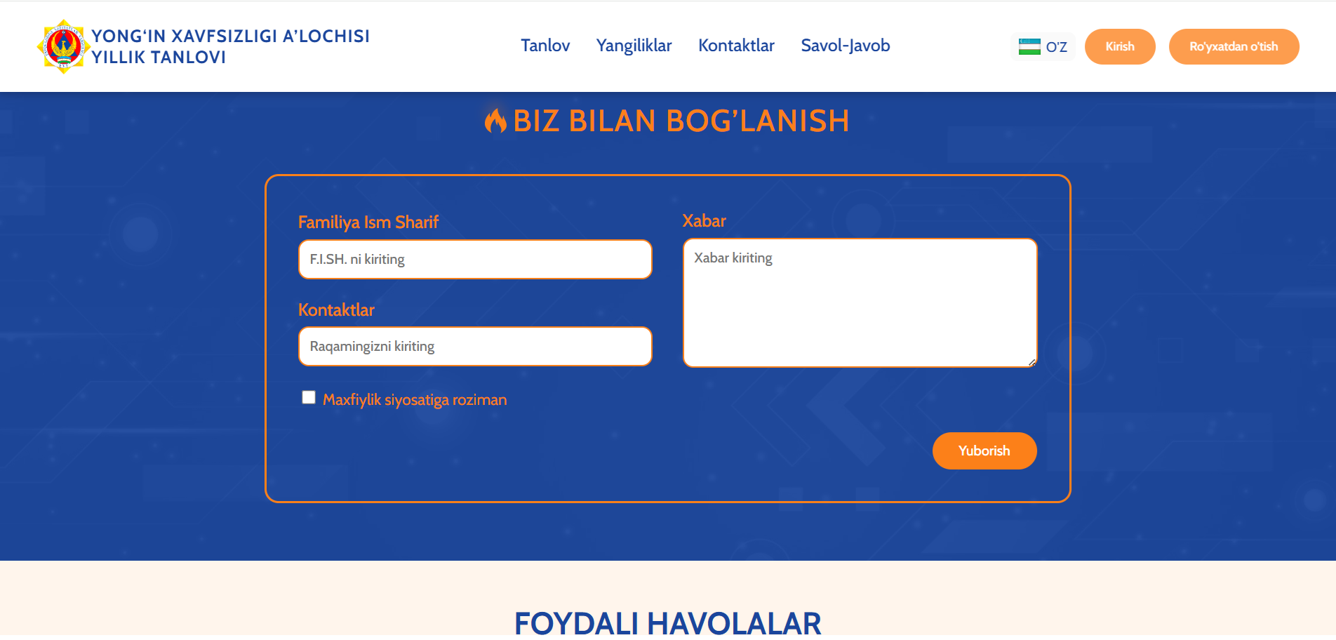 Информационная система «Лучший в области пожарной безопасности» — это система, разработанная Министерством по чрезвычайным ситуациям Республики Узбекистан для цифровизации процессов проведения ежегодного конкурса «Лучший в области пожарной безопасности».